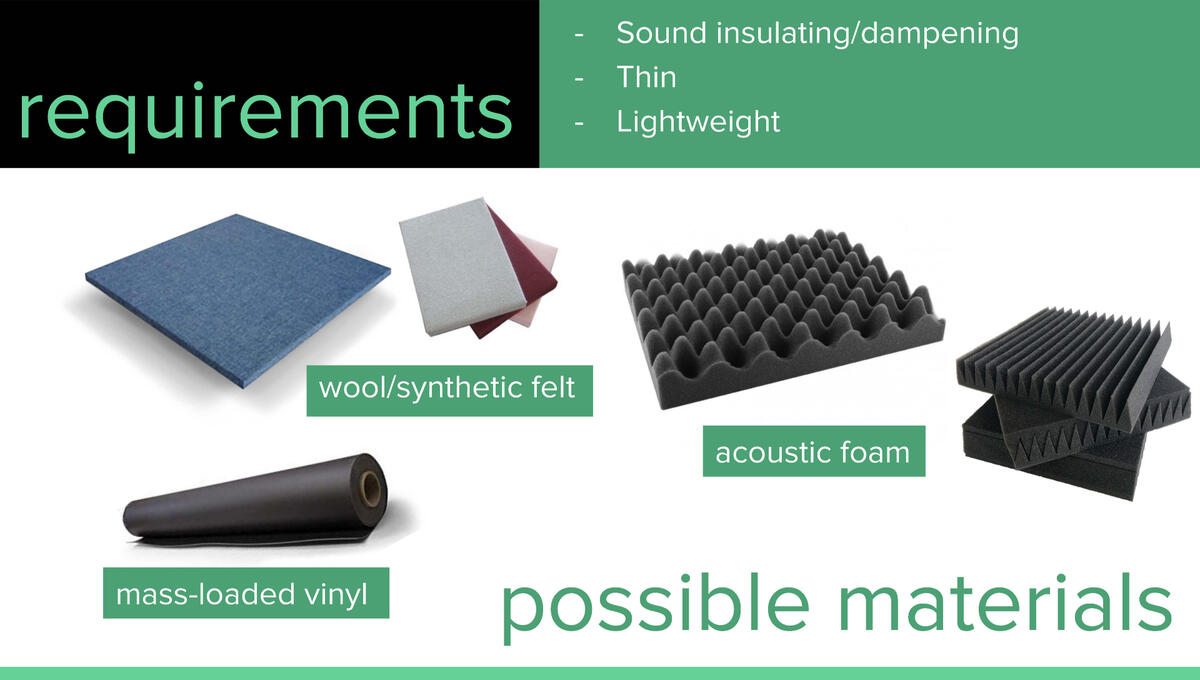 We explored the different materials that have sound dampening properties and considered whether we should use high-density or low-density materials. Many acoustic screens and baffles utilize materials like wool, felt, MLV and acoustic foam.