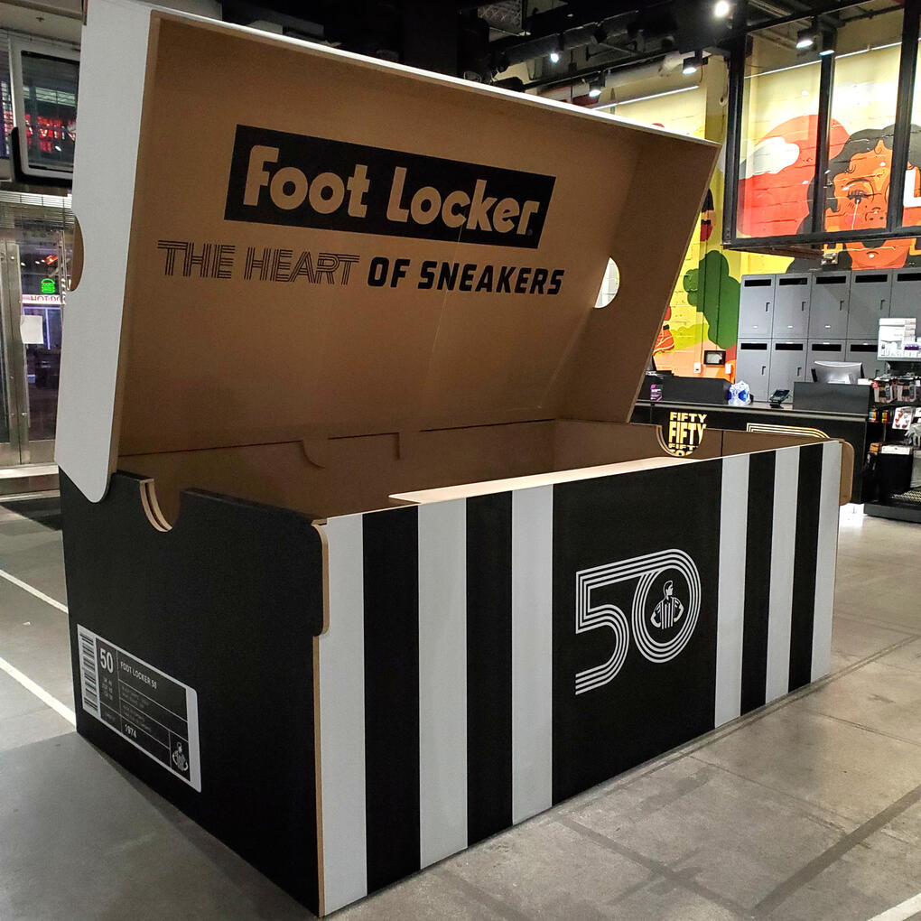 Playful DJ booth designed to look like a 10ft scale shoebox for Foot Locker's 50th anniversary exclusives celebration.
