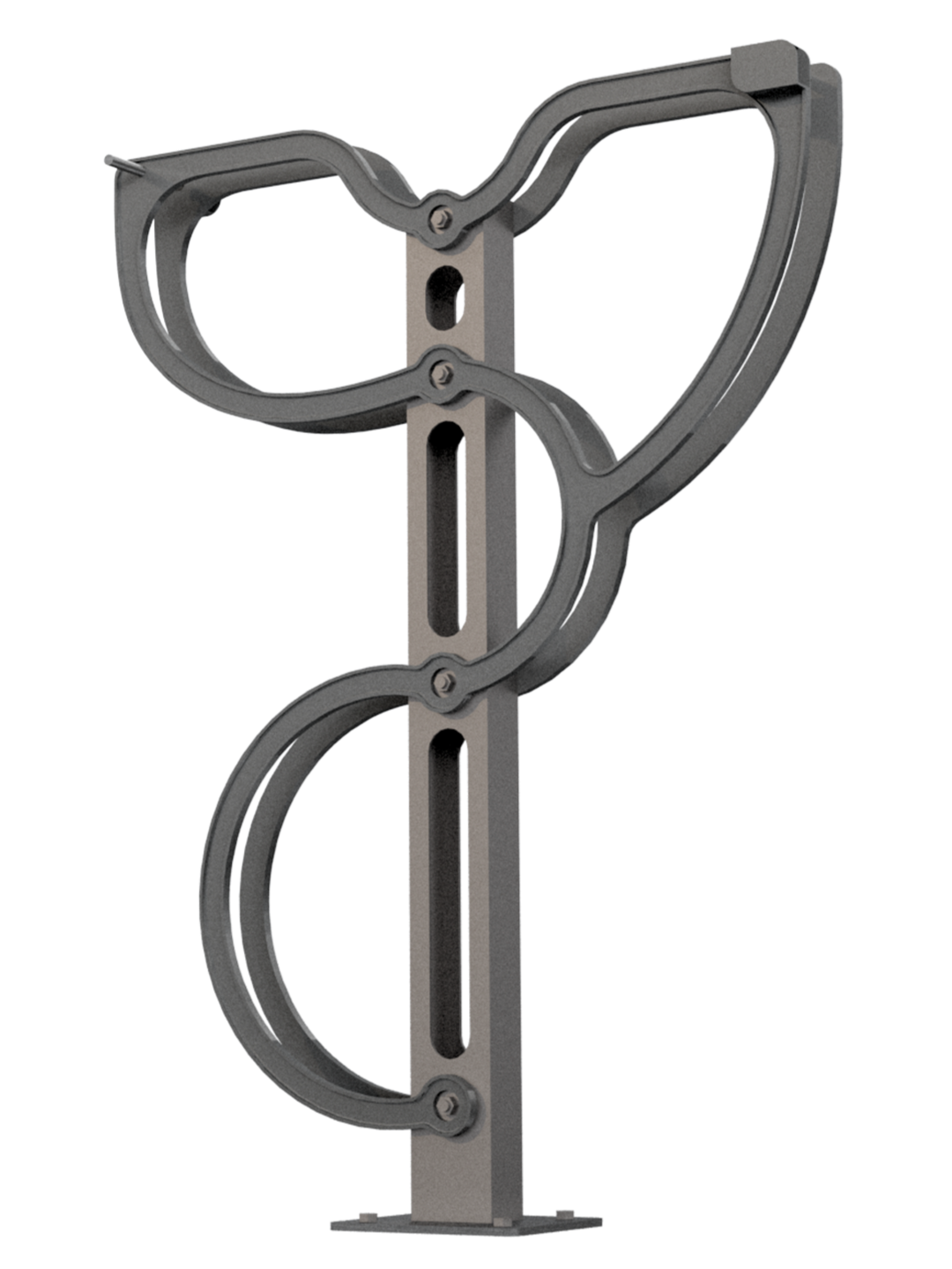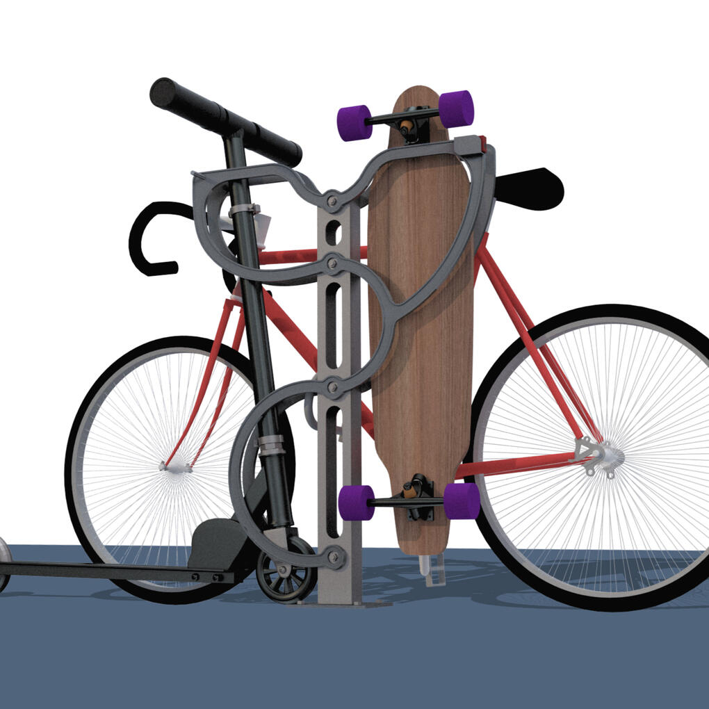 Competition winning multi-modal rack that accommodates bikes, boards and scooters in Toronto.