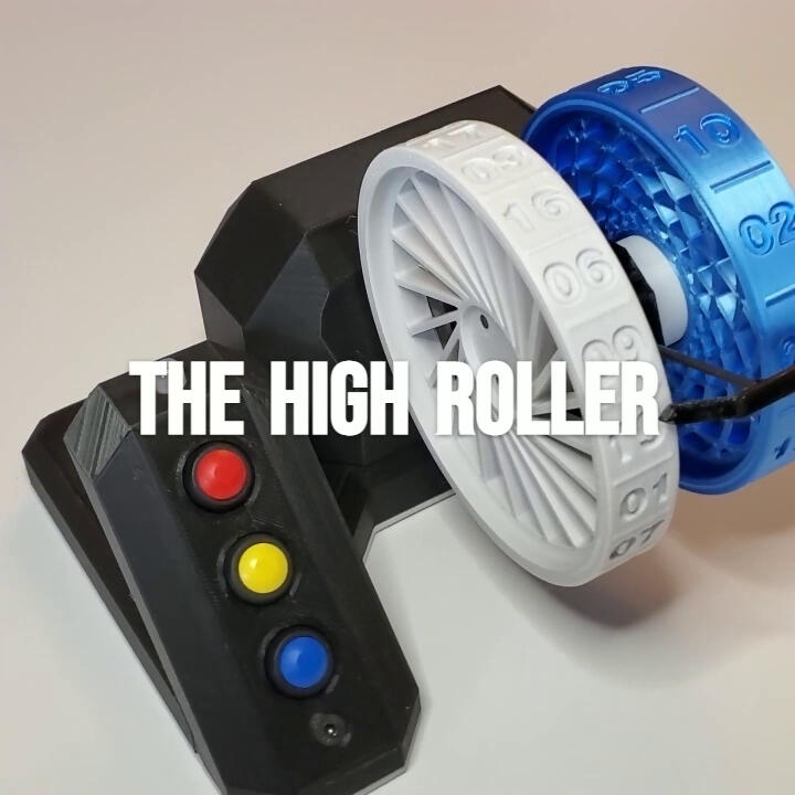 Introducing the High Roller - an automatic dice roller. Designed to generate a random number, truly randomly, every time, without being limited to 4, 6, 8, 12 or 20 sides.The High Roller has 2 independent motors inside that transfer their rotation to a bearing via a belt with a 2:1 gear ratio, allowing the discs to spin up to 166rps. The device has 3 buttons that will spin the discs in 3 different ways: The red button will spin it until you let go, the yellow button spins it back and forth randomly, for a random duration, at a random speed a random number of times (yes, that is a lot of random), and the blue button will spin it for 1-5 seconds at a random speed. When a button is pressed it immediately activates the motors and the RGB LED which glows the colour of the button to visually indicate which spin profile has been chosen.The dice-discs have been designed to magnetically couple to the bearing cap in order to be easily removed and replaced with an unlimited variety of other discs. The two dice-discs I printed for this project have 20 sides and 12 sides respectively to demonstrate how standard dice may be replicated as discs – down to the way the numbers are distributed around the ring (numbers on opposite sides add up to 1+maximum number) – but I plan on printing a full set of standard dice, as well as specialty discs that could never be represented on a regular polyhedron; such as a set of discs with the English alphabet as a means to generate random initials. The possibilities are truly endless.