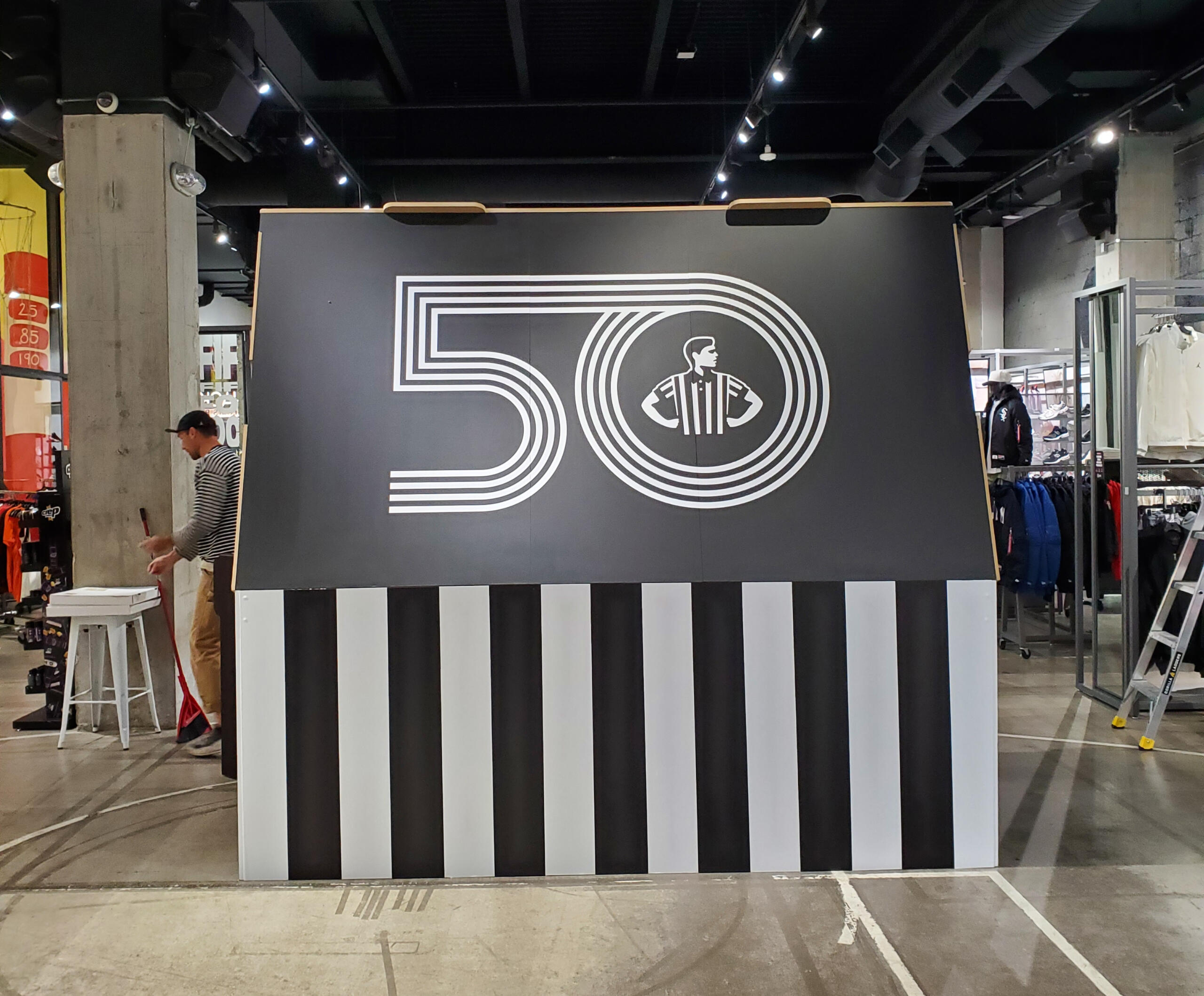 Playful DJ booth designed to look like a 10ft scale shoebox for Footlocker's 50th anniversary exclusives celebration.