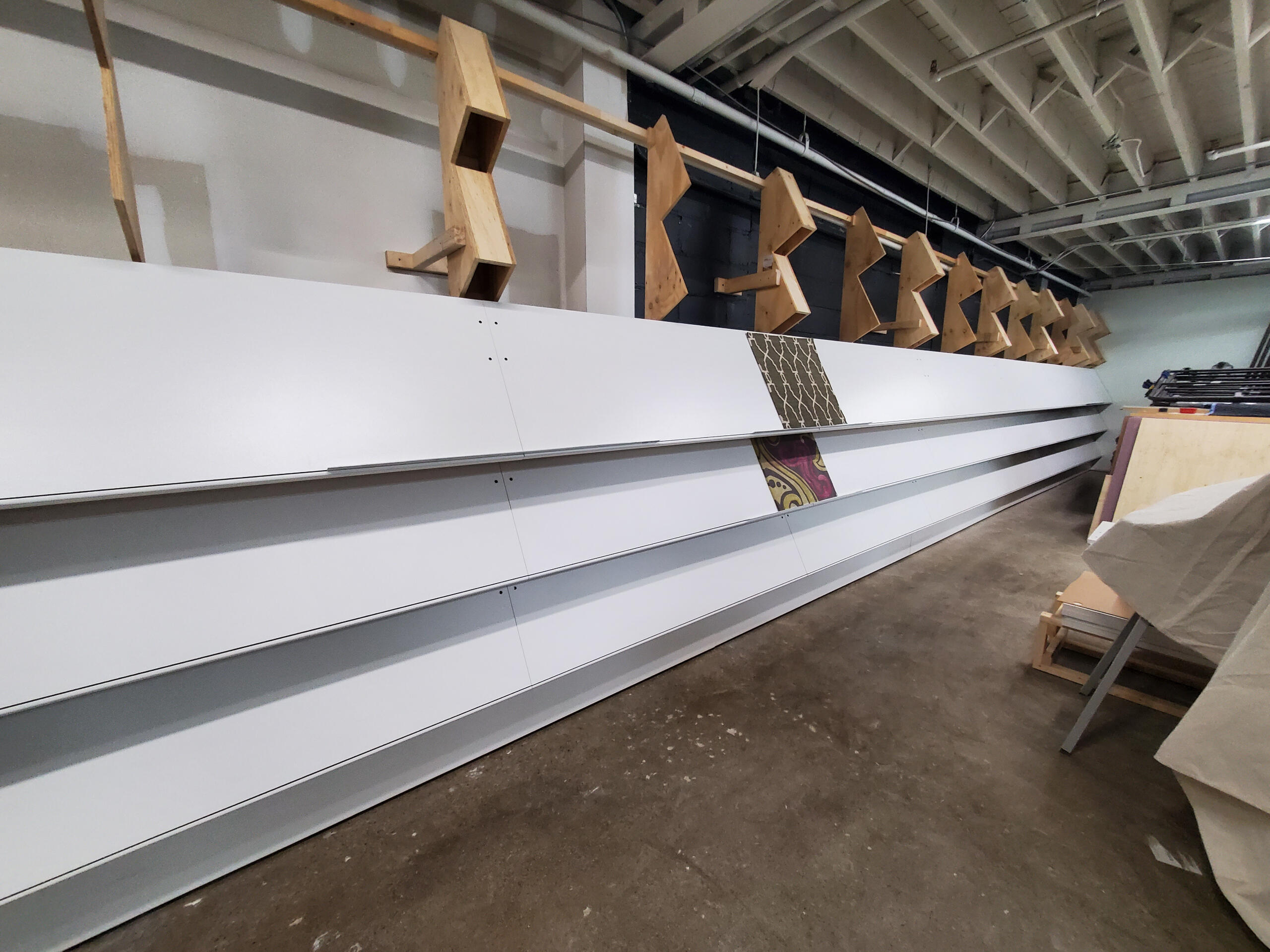 We also experimented with a few cut patterns for the panels. The horizontal cut lines were definitely more effective than the vertical cut lines as the panels needed more rigidity in the x axis as well as looking better aesthetically because it contrasted the verticality of the panels.