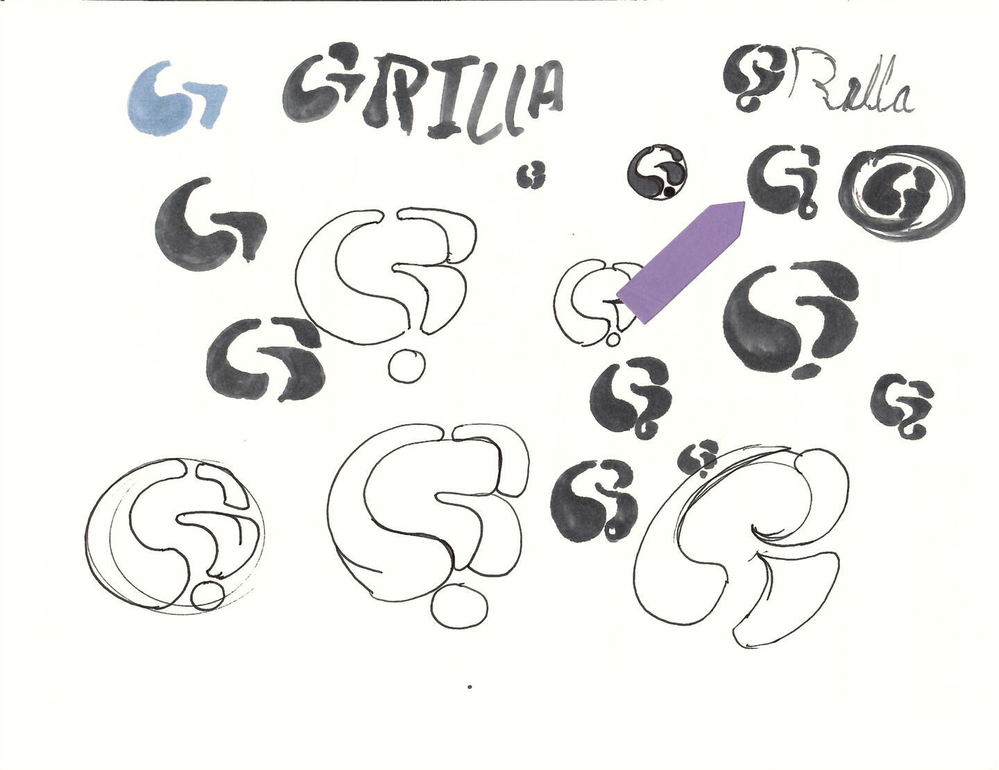I explored some other concepts based around the idea of a backwards question mark hidden in the negative space of the G. The style was inspired by graffiti and is meant to feel bubbly and playful. In some of the ideation I was playing with the idea of composing the G of shapes that were indicative of an apostrophe or an arrow to capture some movement in the logo.