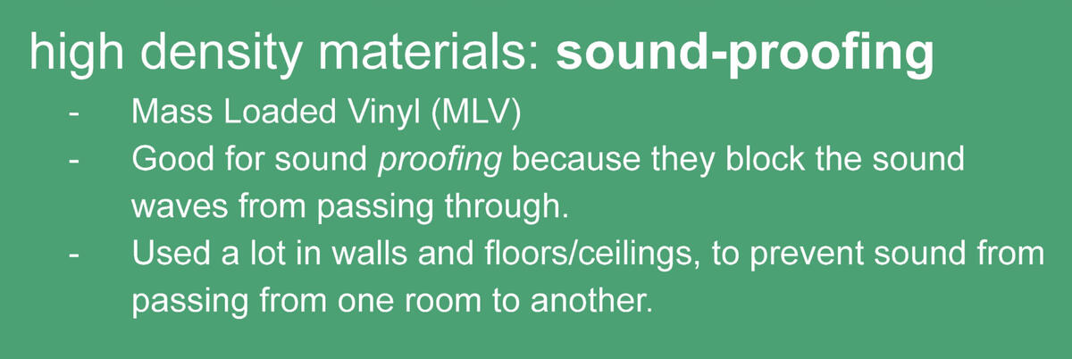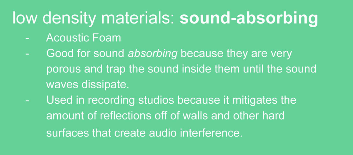 We discovered that low-density materials create the environment we are aiming for, since we don't need to reduce the amount of sound transmitted through the material. Lower density materials are better for reducing sound reflected back at the mic which will create a better sound profile when recording by reducing the perceived room size.