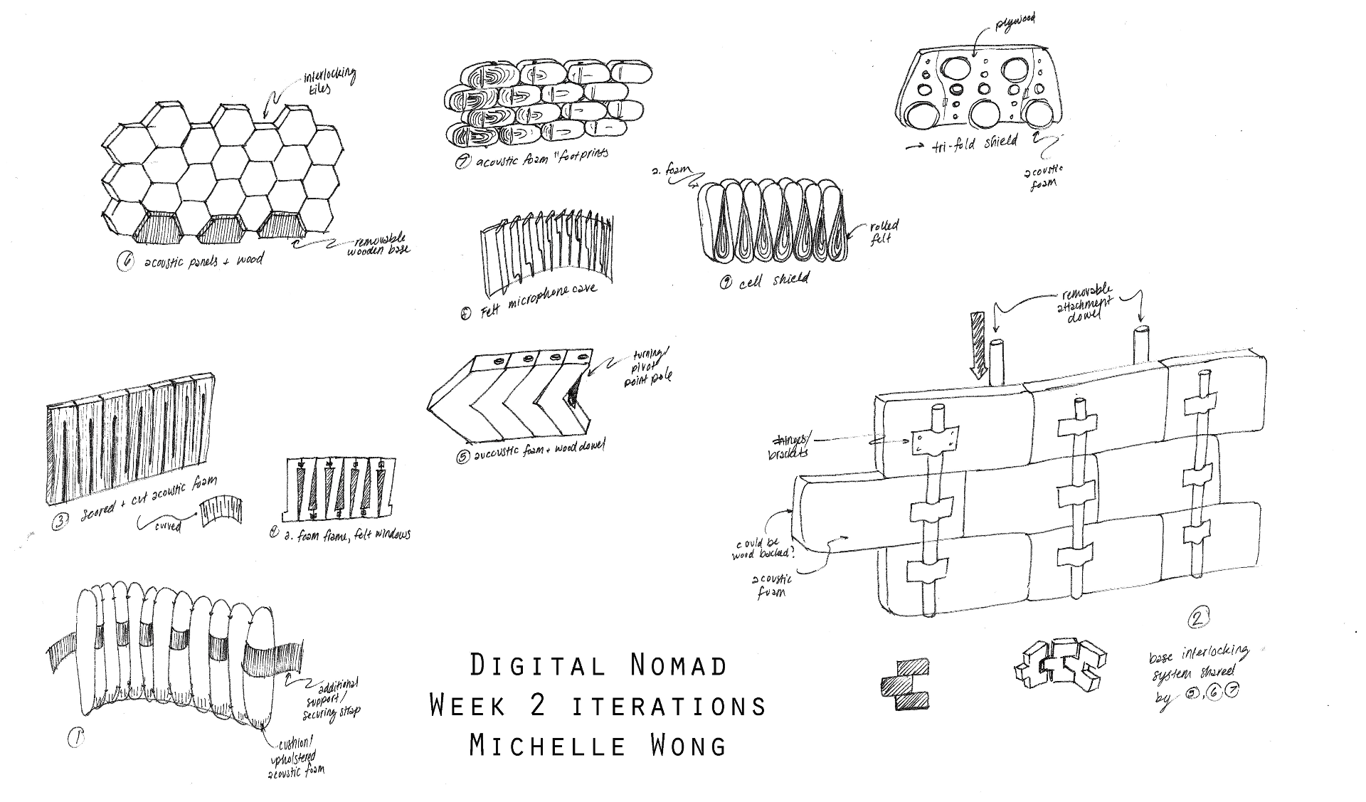 We explored possible shapes and designs for the acoustic screen that were based around the idea of using a 2-layer panel system with a hard outer shell and a soft, low-density inner wall.