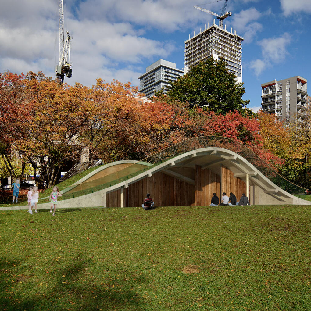 Design for performance stage emerging from the earth within the Kerr Hall Quad.