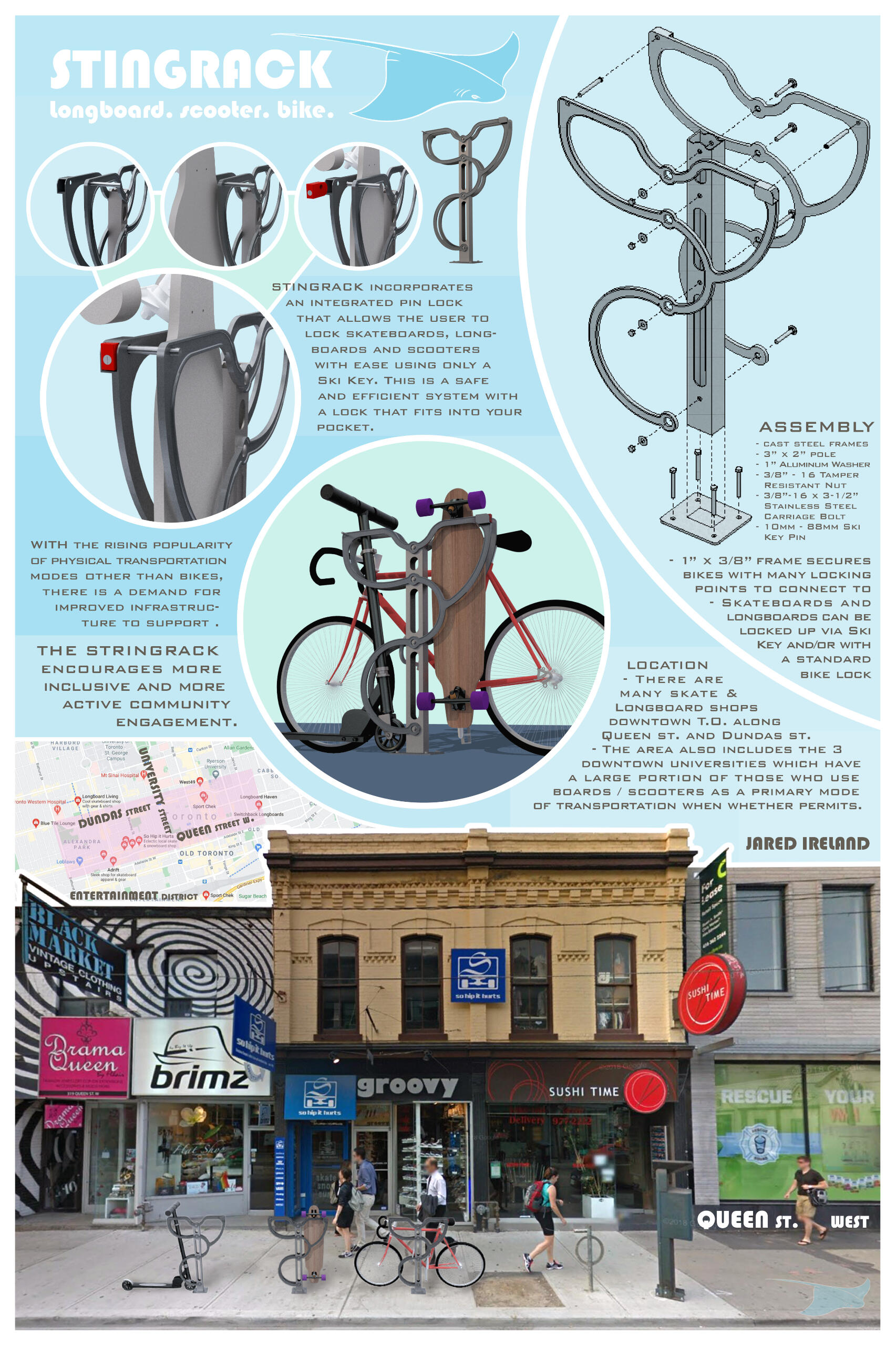 Competition winning multi-modal rack that accommodates bikes, boards and scooters in Toronto.